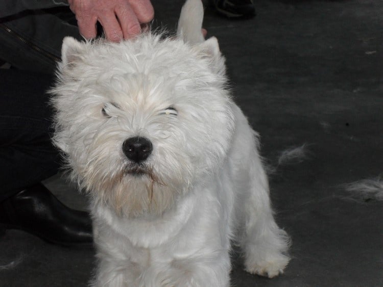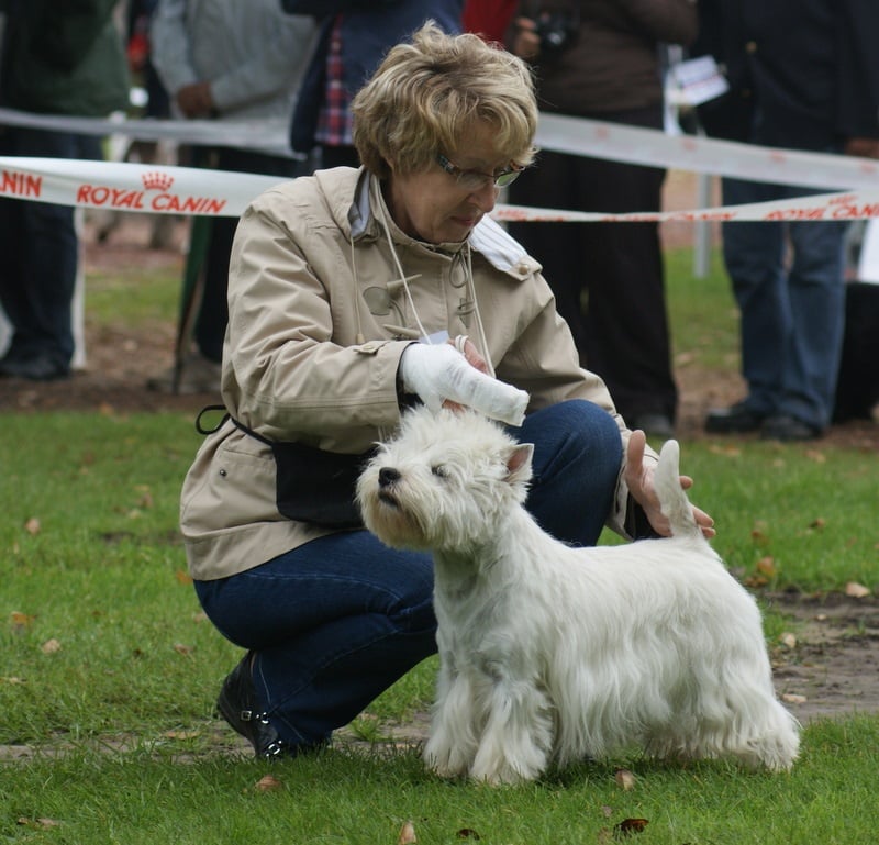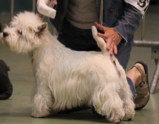 tres jolie tête et expression, excellent crâne, chanfrein, pigmentation, DCC, exc oreilles bien portées, exc encolure et dos, exc poitrine avec un rein cour, exc poils, fouet bien porté, mouvt régulier avec une belle poussée a l'arriére
