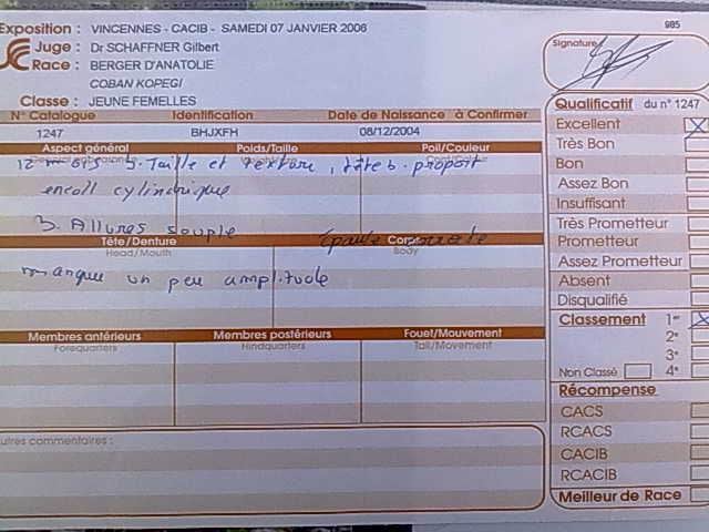 chienne jugee de tres tres bonne qualitequi aurait a coup sur ete recompensee du CACIB et CACS et BOB par le juge a ses dires si elle avait ete presentee en temps et en heureretard de 1 heure tres vite considere comme une absence totaleetre la et se sentir "invisible" c est bizarremais bon c est pas gravevoir details jugements en albums photos