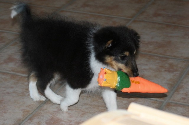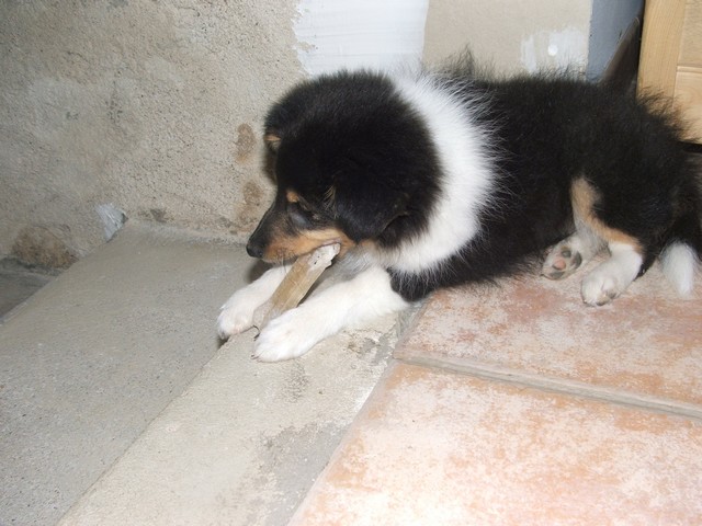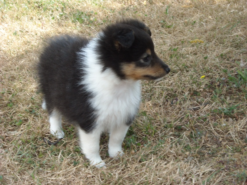 dentition complète, très bon comportement,taille au maximum, tête de forme correcte, très bon port d'oreilles, oeil de bonne couleur,bon dessus dessous,les aplombs manquent encore de régularité, robe tricolore de bonne couleur,très bonne démarche, mouvement correct