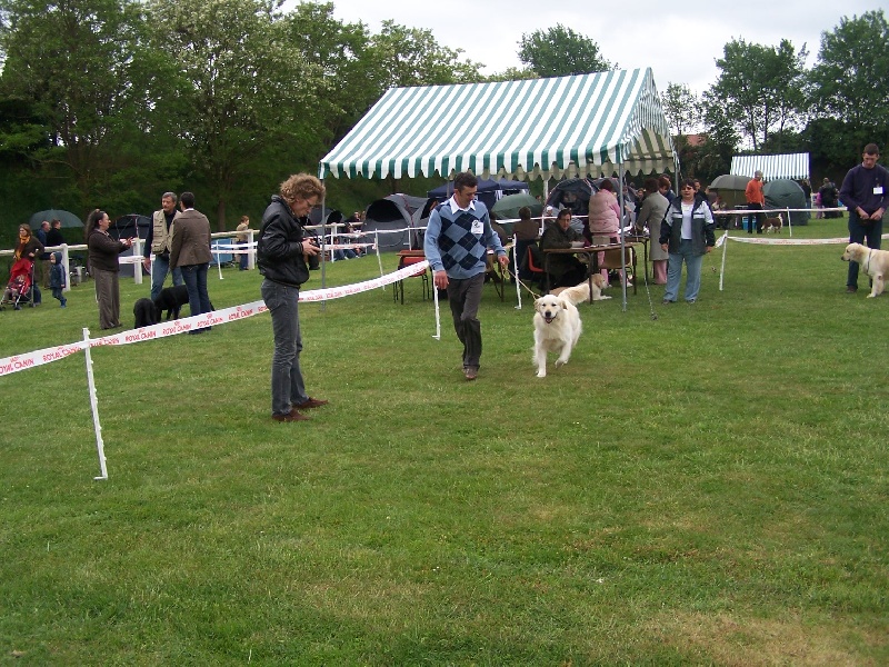 Jolie tete expressive,manque un peu de bout de museau,Tres bonne epaule,encolure.Ligne de dos legerement descendante,Excellente angulation,Excellente demarche,ossature un peu juste.