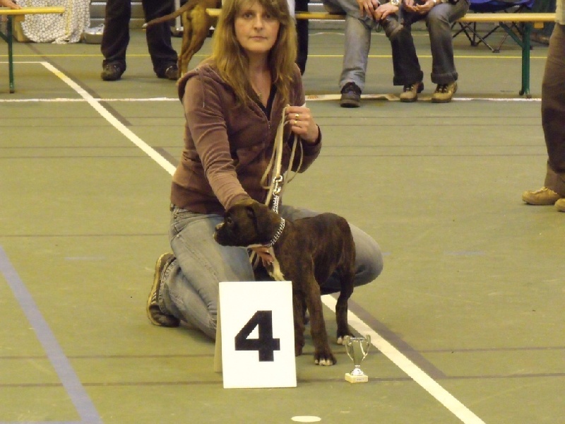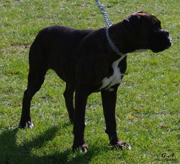 6 Mois - Bringé foncé - Excellent type de tête -Excellent Rap C/M - Très beau yeux Forme et couleur - Denture moyennement large - Longeur de nez correct - truffe large - Excellente sortie d'encollure - Très bonne angulation AV/AR - Cuisses large - Forte ossature .