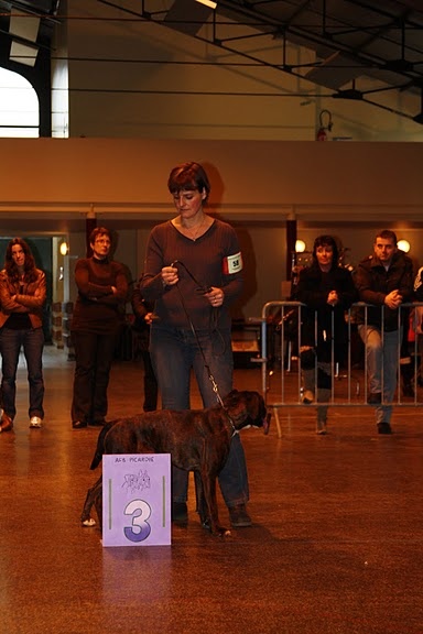 7 mois 1/2 bringe fonce, tres beau type de tete feminine, yeux sombre positionne legerement lateralement, longeur de nez correct, denture moyen large avec un fort prognatisme pour son age, truffe large, constrution carre avec belle sorti, Ex croupe et port de queue tres belle angulation av/ar.
