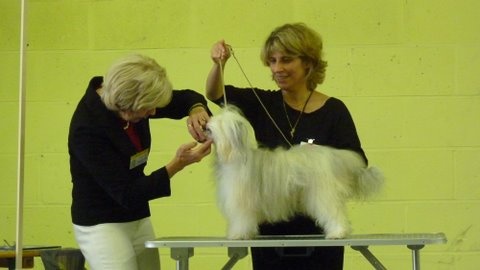 Superbe qualité de fourrure typique, excellente machoire en cideaux, jolie femelle bien féminine, solide, excellente angulation avant, pieds typiques, poitrine bien dévellopée, très bonne angulation arrière, encolure bien insérée, jolie tête avec un bel oeil, expression mise en valeur par la pigmentation, oreilles bien attachées, excellent crâne et museau. Démarche correct