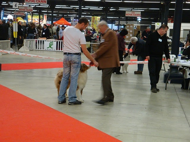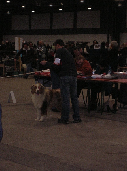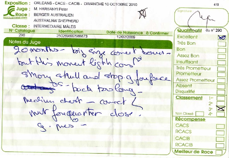 Caractère réservé. Poil bien structuré mais hors condition. B tête et Lg. Tête typique Beau désirerait plus de forme en L dos. B poit + ventre B angul. Pas tjs libre en mouvement.
