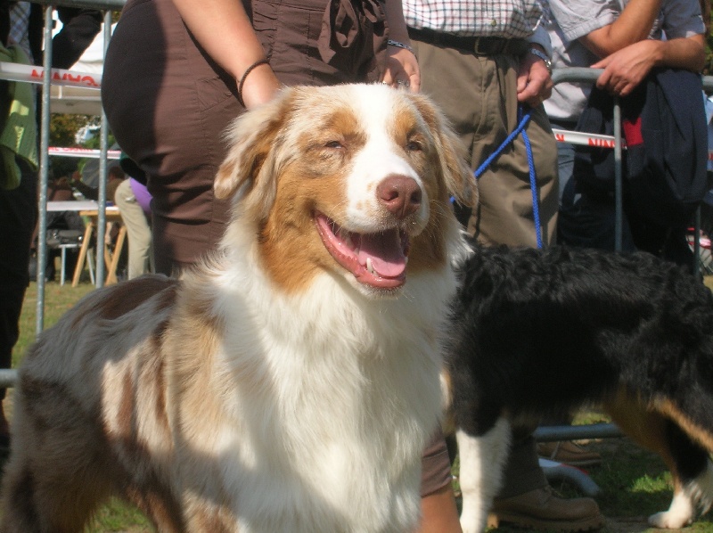12 mois. Exc. Gabarit. Superbe robe rouge merle. Pigmentation suffisante. Ossature remarquable sans lourdeur. Ens. de tête très typique. J'aime beaucoup. Exc. contact.