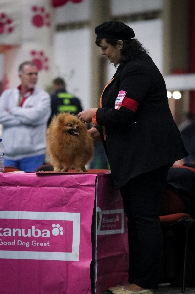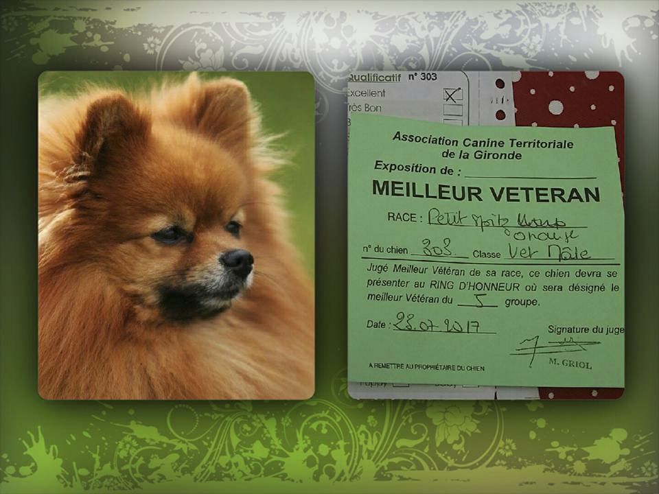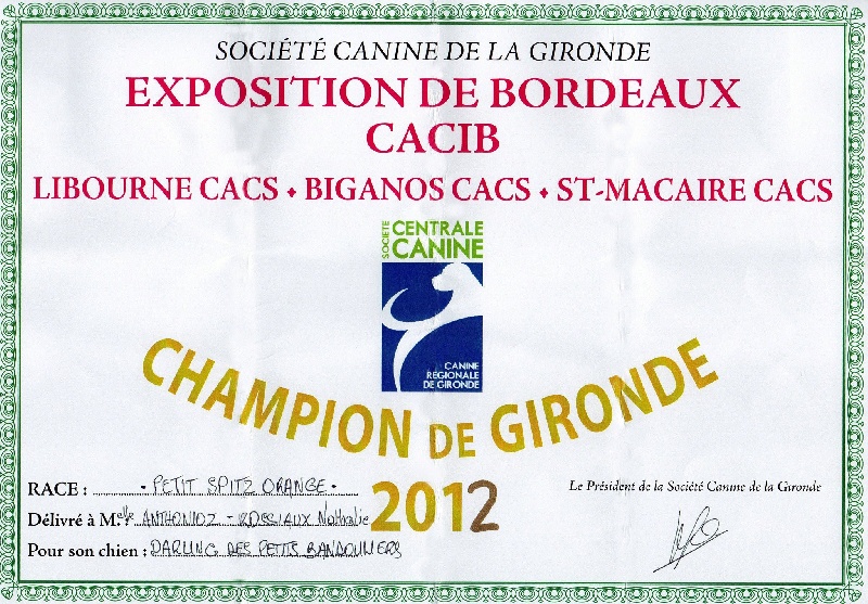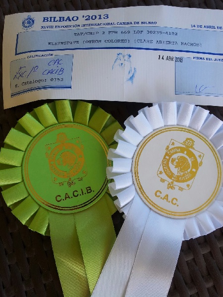 Excellente occlusion, tête bien typée, bon stop, oreilles bien attachées, oeil bonne forme, et couleur, bonne pigmentation,ossature fine, bonne forme de poitrine, et côtes, bonne attache de queue, dessus solide, bonne couleur, bonnes proportions, bon pieds, bonne poussée, mouvement dynamique et régulier.RCACS et RCACIB, champion de Gironde 2012, Meilleur champion du 5ème groupe, Meilleur champion des champions de Gironde 2012.