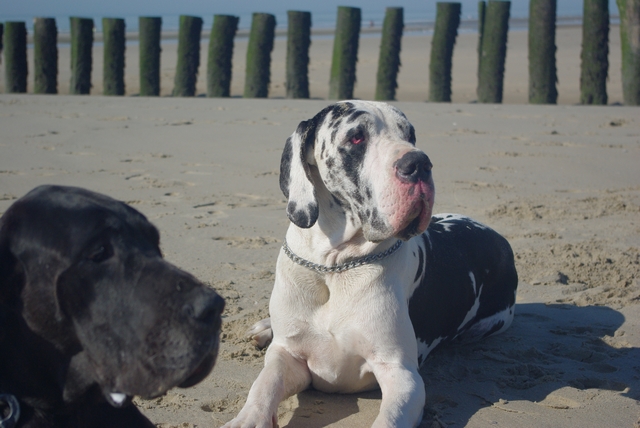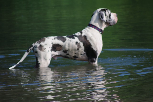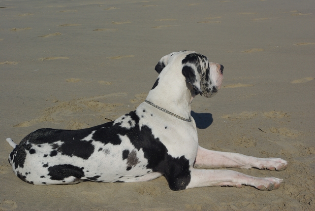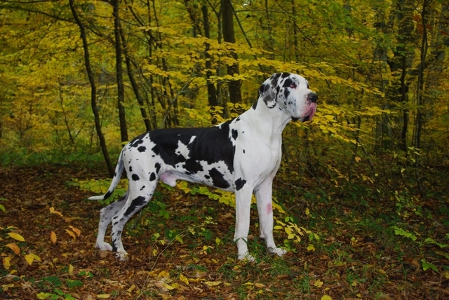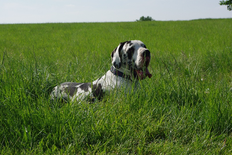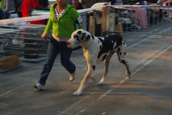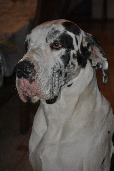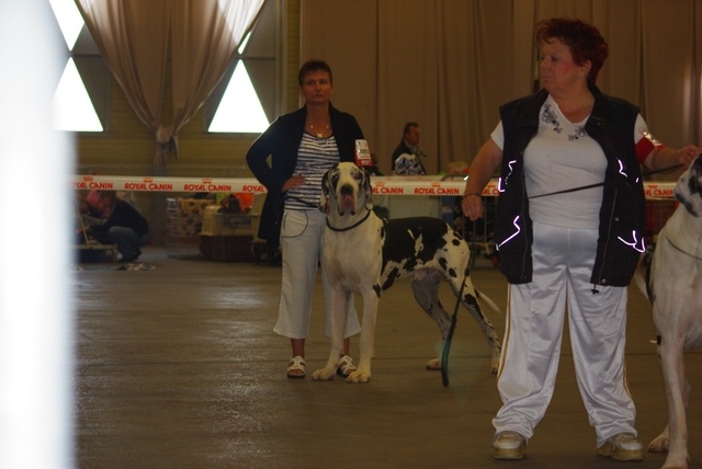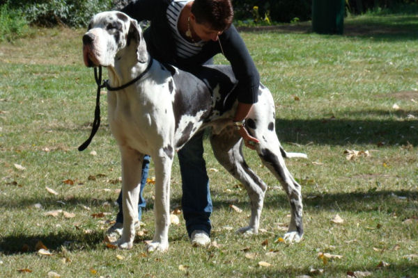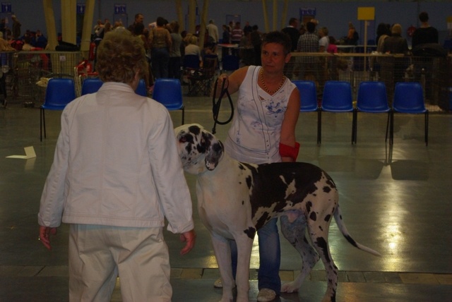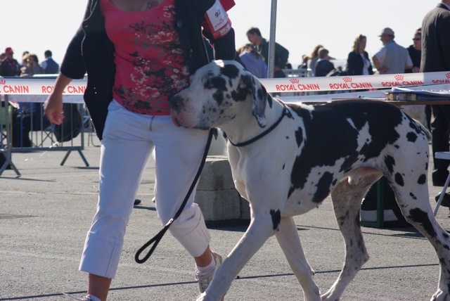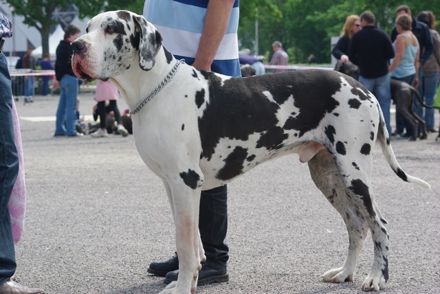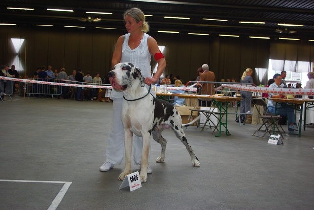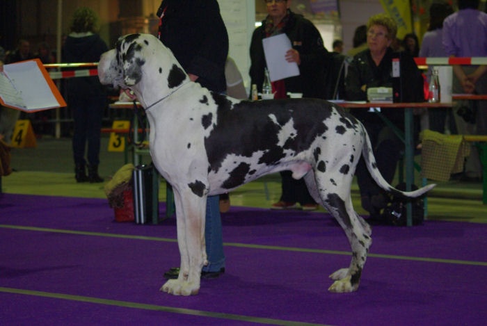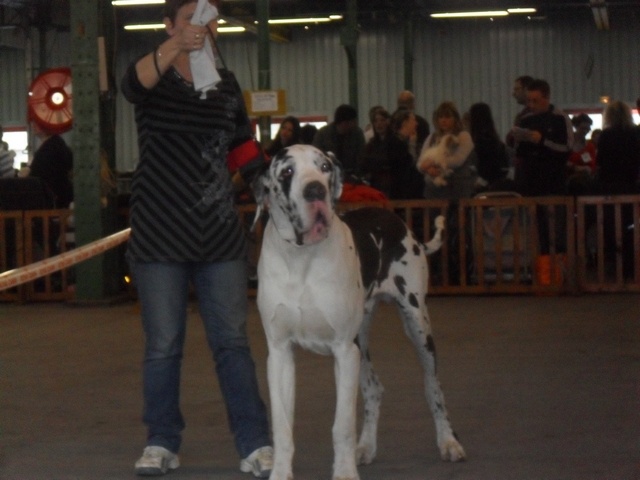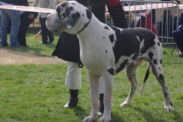 17 mois, 84cm, gr chien, bonne prop, bonn construction, belle poitrine. Exl cuisses et jarret. Encolure puissante, hauteur de babines exagères, bon // der et devant, m ample de profil, belle robe arlequin, présente trop de fanon.