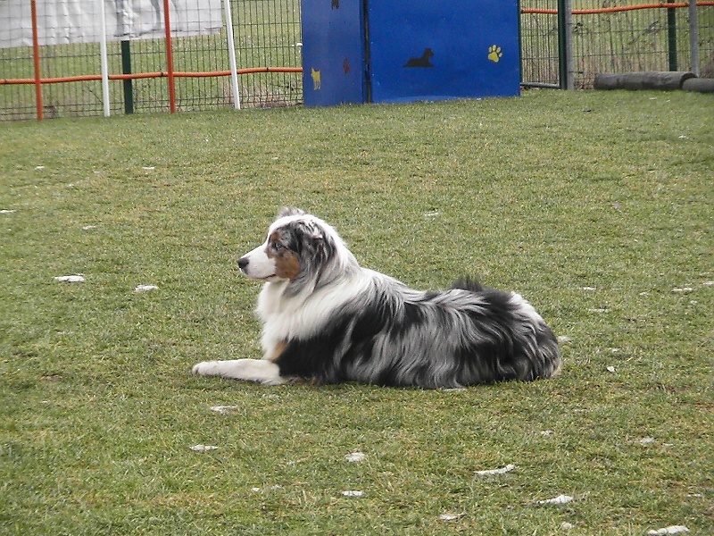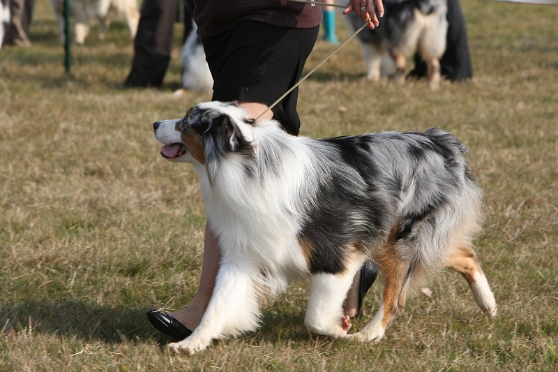 dcc grande taille bleu merle b texture b proportion en tete //correct b pigmentation port oreilles dysimetrique encolure un peu courte angul un peu juste tbossature croisse legerement par moment aux allures plonge sur lavant main aux allures marque pousse arriere