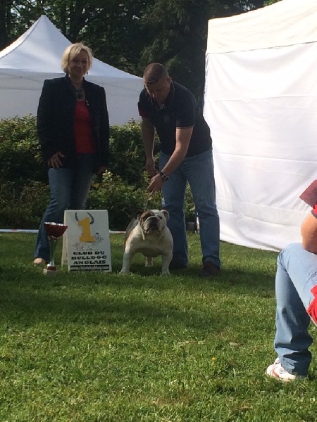 Sable et blanc. En excellente condition. Sujet bien proportionné. Tête avec une bonne expression typique. Bon lay-back. Bonnes rides. sclérotique apparente lorsque le chien regarde devant lui. Oreilles un peu grandes et épaisses. Bonne ossature. Bonne ligne de dessus. Bon arrière-main. Queue droite. Démarche lourde et contrainte typique. Excellente présentation.