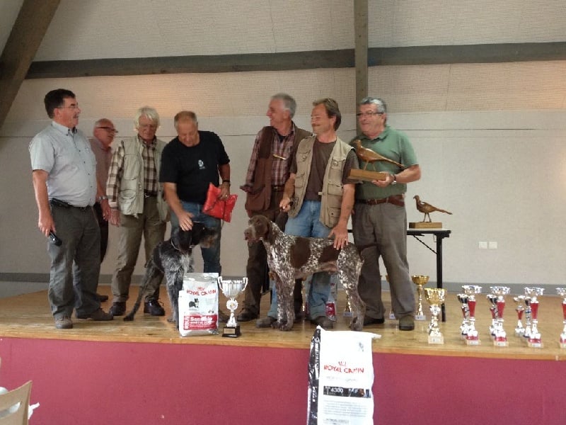 Très beau et excellent parcours,belle quête,bonne exploration du terrain,excellent port de tête,bel arrêt ,respect de l'envol et du tir,attente commandement de rapport et excellent rapport,remise du faisan en main. Pour le barrage ,belle allure et port de tête. Esus s'est installé très vite sur son terrain .
