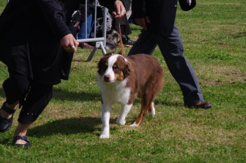 Excellent type bien mâle. Excellent ligne de profil. Excellentes oreilles pigmentées. Crâne large. Dentition complète en ciseaux. Jolie ligne de dessus, très harmonieuse bien tendue et solide. Très bonne hauteur de poitrail avec potentiel qui va permettre le développement. Excellente forme des côtes.Angulations arrières un peu ouvertes exagérées visuellement par le toilettage.Fourrure dont le sous poil a trop été enlevé.Joli mouvement efficace.