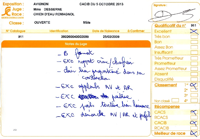 Engagement en Classe « JEUNE Mâle » sous le n°??? -/- Handling : Pascal DOUIS -/- Juge : Monsieur Laurent PICHARD (Suisse) -/- Qualificatif : Excellent -/- Classement : 1er -/- Récompense : BOB -/- Notes du Juge : « ???? » (ndj)