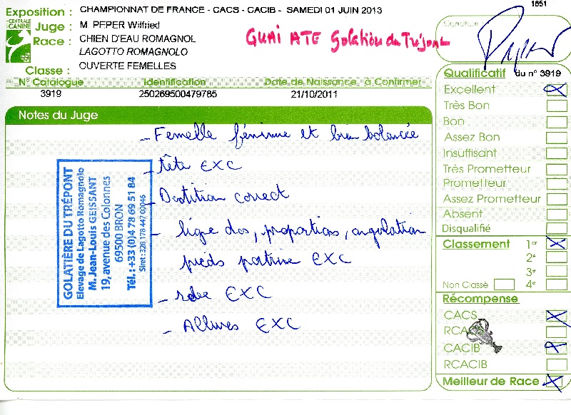 Engagement en Classe « JEUNE Mâle » sous le n°726 -/- Handling : Golatière du Trépont (GdT) Jean-Louis GEISSANT - /- Juge race & 8ième groupe jeune : Madame Dominique CORNET GOUGON (France) - / Juge BIS Jeune : Monsieur -/- Qualificatif : Excellent -/- Classement : 1er -/- Récompense : 1er du 8ième Groupe Jeune, BIS Jeune -/- Notes du Juge : « Exc Construction d'ensemble Exc tête typique avec une oreille bien placée, Exc pigmentation, Exc sortie d'encolure, Exc épaule, aplombes et pieds, Exc poitrine a encore besoin de l'étoffer, Exc corps avec une belle ligne de dos, Ecc arrière main à la cuisse longue, Exc attache de fouet, Exc qualité de fourrure, Exc mouvement » (ndj) -/-