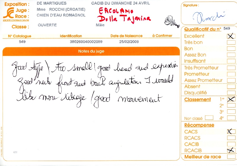 Engagement en Classe « JEUNE Mâle » sous le n°17 -/- Juge : Monsieur Giovani MORSIANI (Italie)-/- Qualificatif : Excellent -/- Classement : 1er -/- Récompense : RBIS -/- Notes du Juge : « » (ndj)