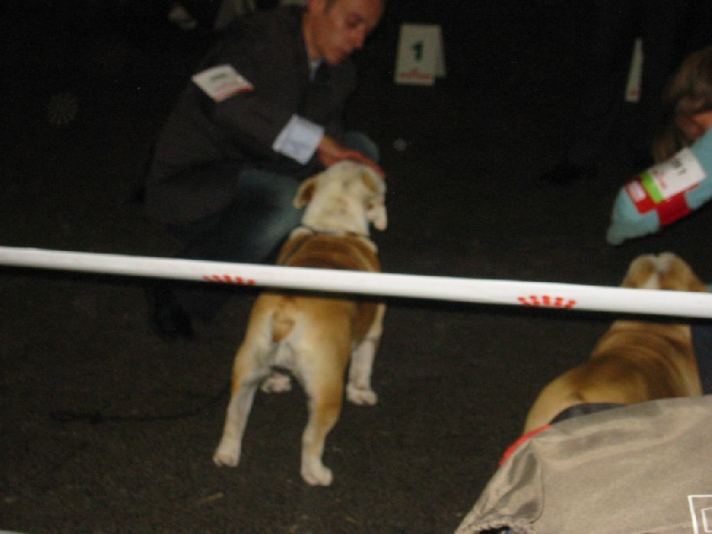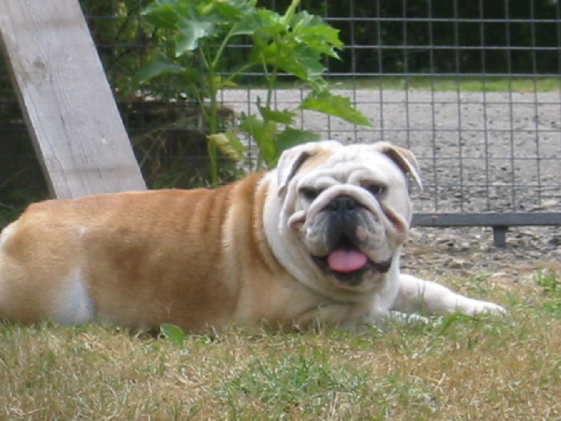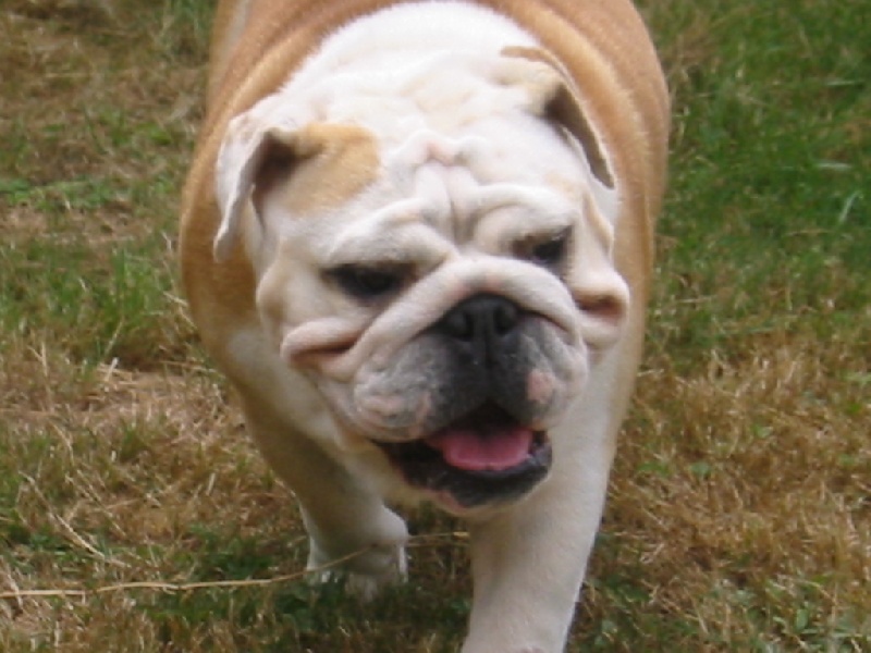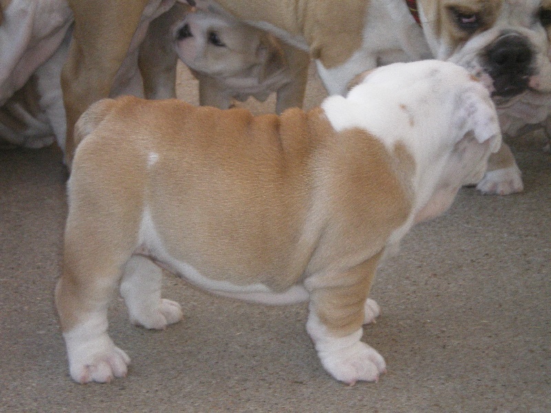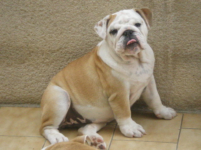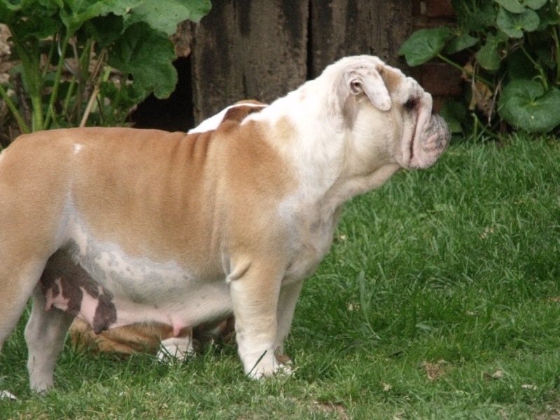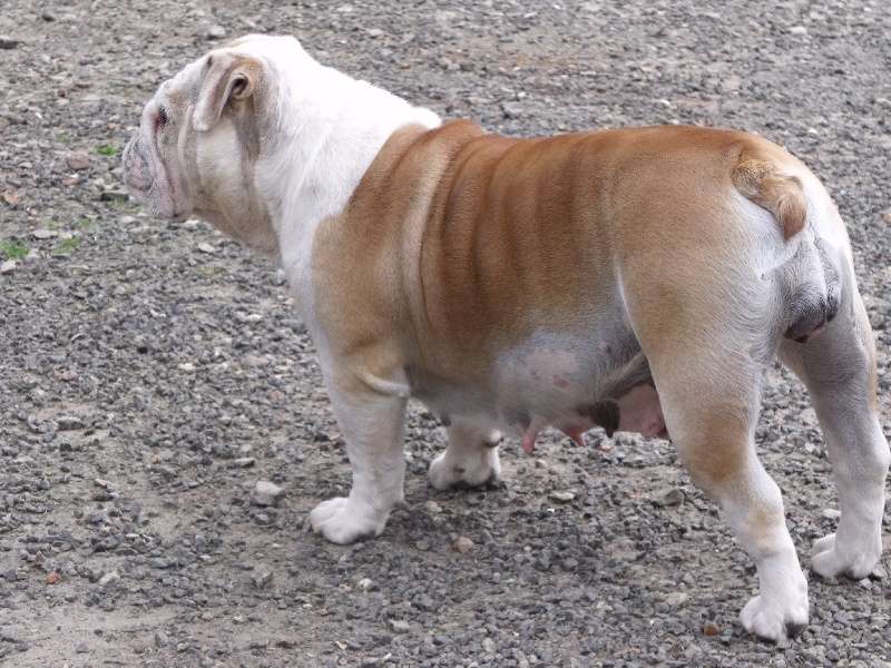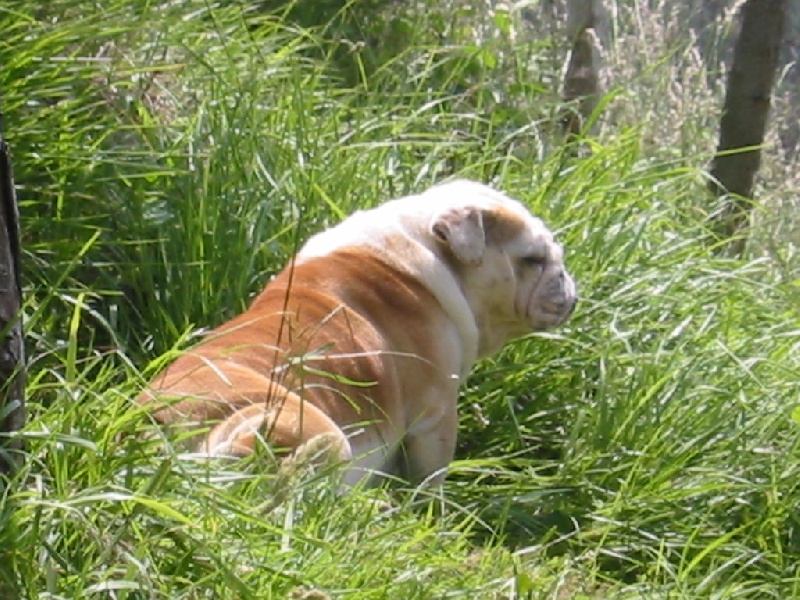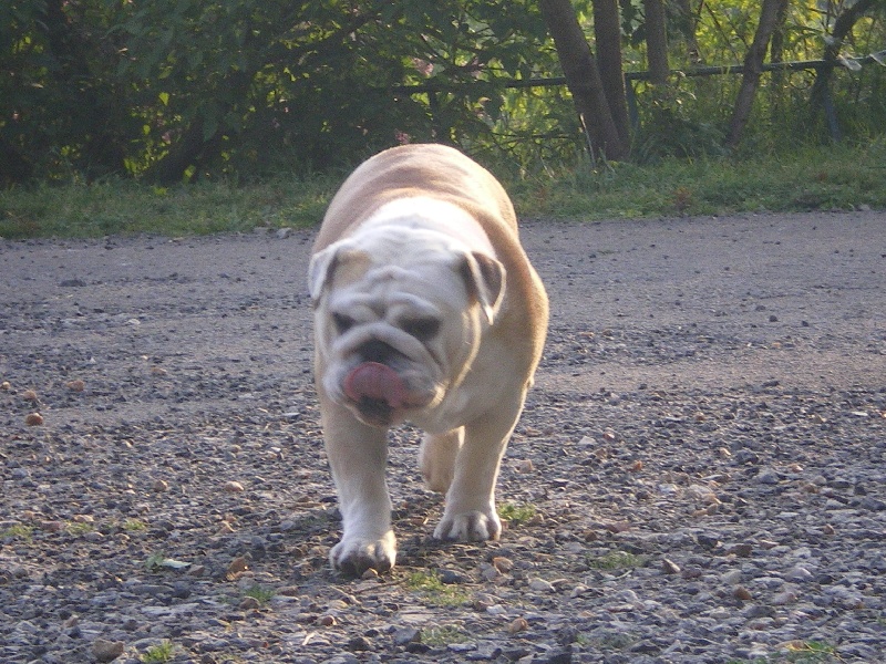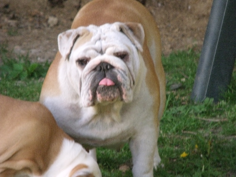 Sujet bien proportionné, tête avec une bonne expression typique, bonne pigmentation, yeux bien foncés, oreilles en bouton, bonne courbure de la mandibule, mandibule un peu étroite, bonne ossature, bons aplombs avant, epaules bien rapportées au corps, bonne ligne du dessus, dos bien court, bon arrière main, bonnes angulations arrières, bons pieds, queue droite. demarche lourde et contrainte typique, sujet équilibré. Jeune sujet déjà bien développé.