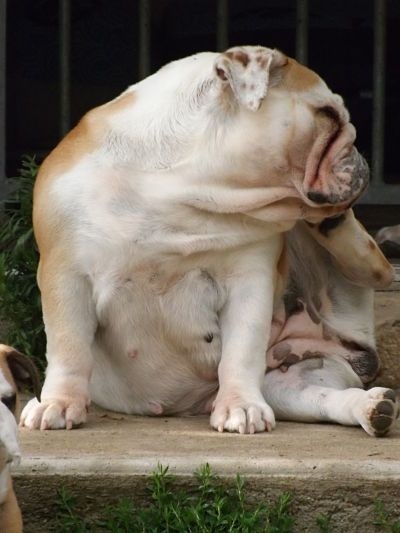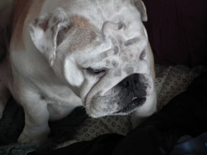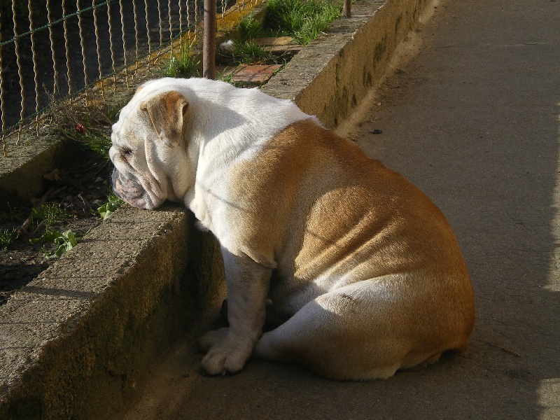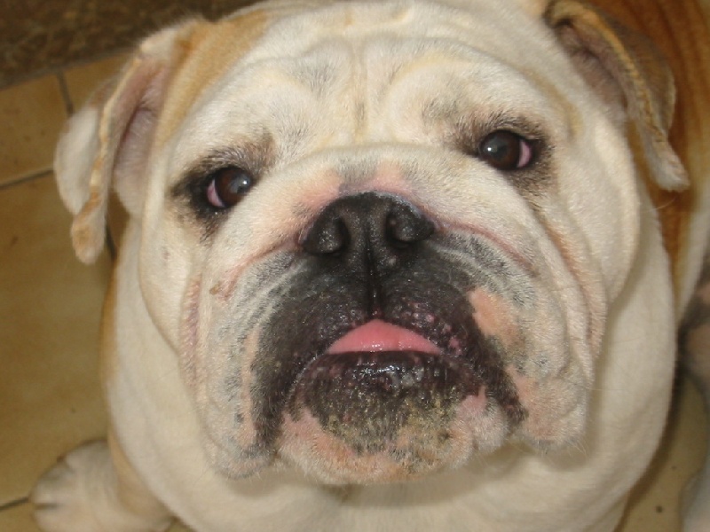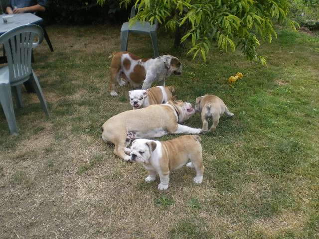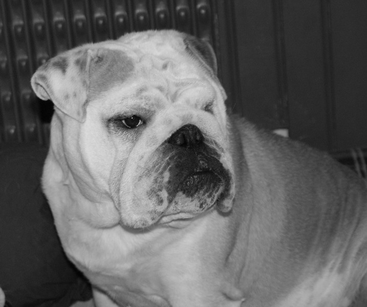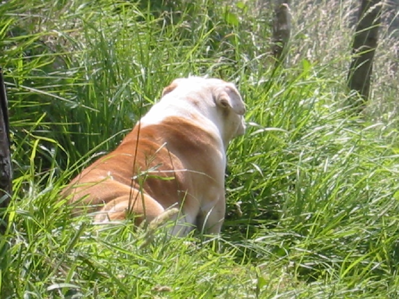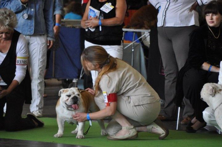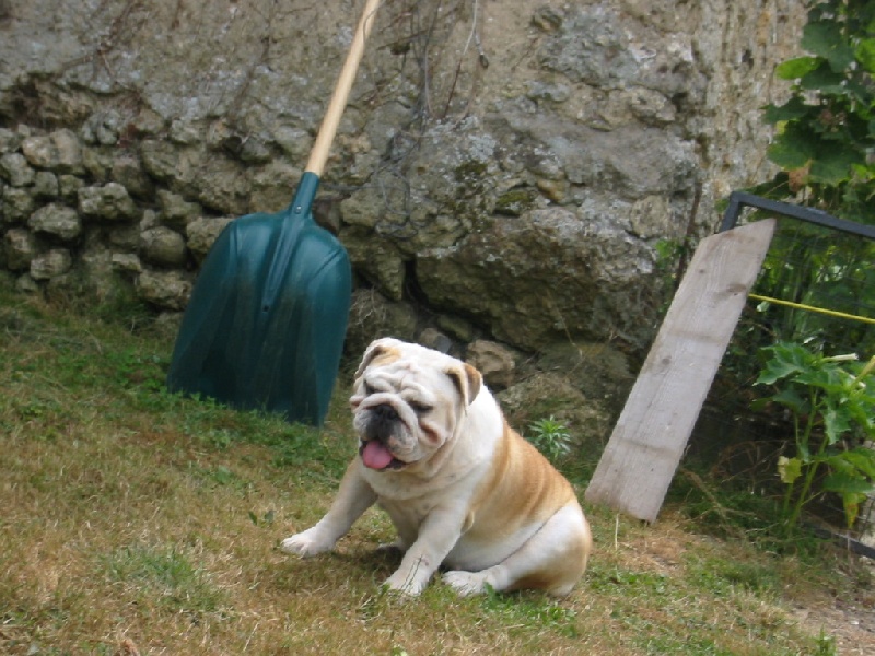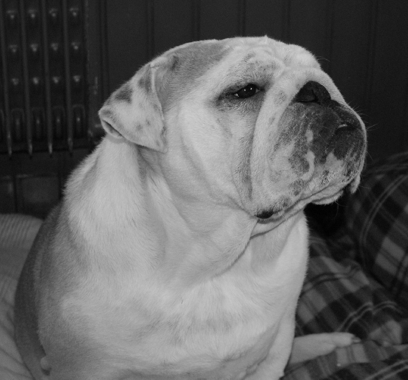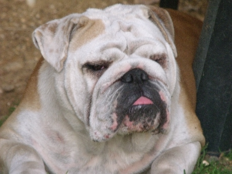 Sujet bien proportionné, tête avec une bonne expression typique, bonne pigmentation, yeux bien foncés, oreilles en bouton, bonne courbure de la mandibule, mandibule un peu étroite, bonne ossature, bons aplombs avant, epaules bien rapportées au corps, bonne ligne du dessus, dos bien court, bon arrière main, bonnes angulations arrières, bons pieds, queue droite. demarche lourde et contrainte typique, sujet équilibré. Jeune sujet déjà bien développé.