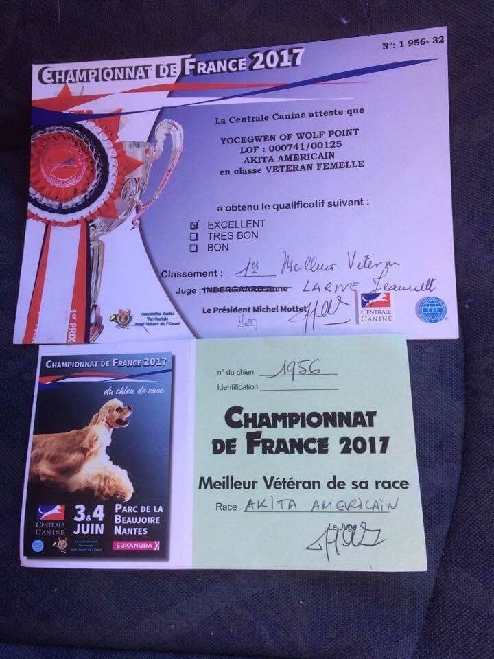 Yoci a 8 ans a eu le plaisir n'ont pas comme dans d autre elevage de reproduire mais d honorer sa belle carrière d exposition par un titre de championne de France.Elle était accompagnée de sa fille Ziva et son petit fils Jumper .