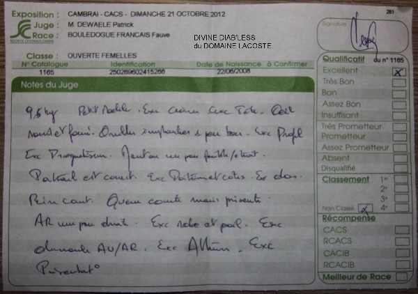 Bon gabaritCorps un peut courtBon applomb avantArriere un peu droitPoitrine correct mais un peu courtPetite queue bien plaquéeExcellent profil de tête avec une bonne boucheBonne demarche et couleurMEILLEUR COUPLE du DIMANCHE avec CHESTER du CLOS des TRUFFES NOIRES
