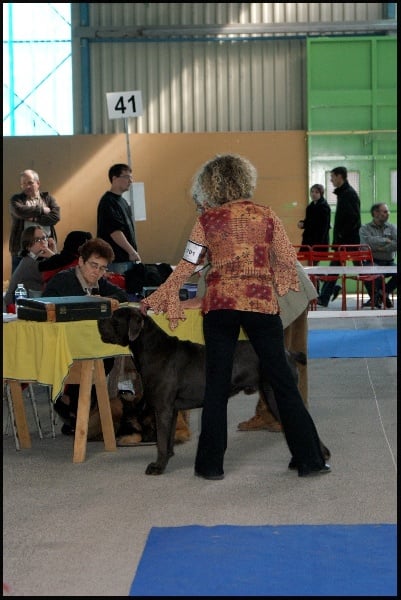 TB oeil asser pigmentéTB oreille bien implantée, portéeBout de museau un peu pincé ; ligne correctTB prop ; Ex dos ; B croupeEx poitrine bonne ossature en apportTB applombs ; B angulationSerre arrière en allureTB mouvement