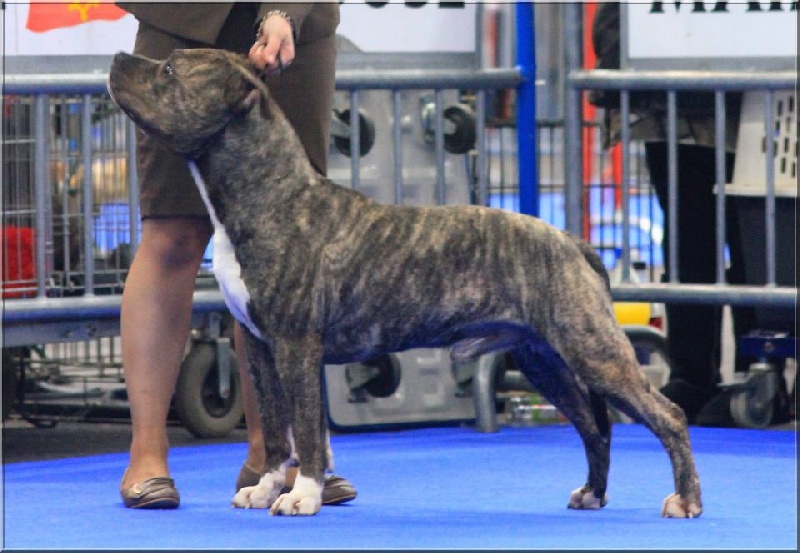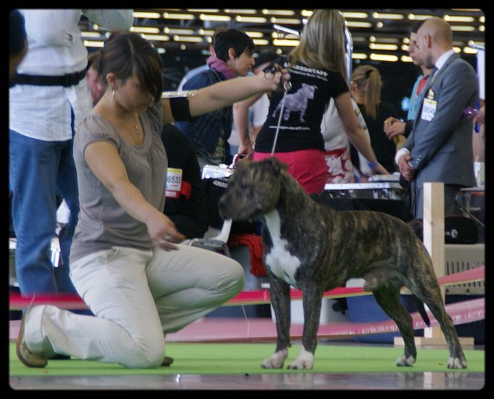 bringé claire, DCC, chien très puissant, la ligne de dos cède déjà très fortement, encolure chargée, TB tête, macitaires corrects, exc œil, ossature puissante, antérieur pas assez rectiligne, exc poitrine, angulations arrières correcte, serre les jarrets, croupe légèrement arrondie.
