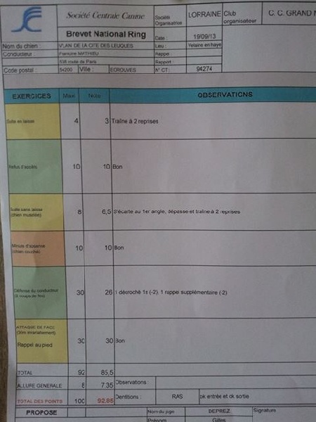 - brevet ring réussit avec 92,85 points . bravo , mon loulou