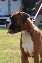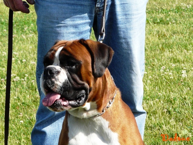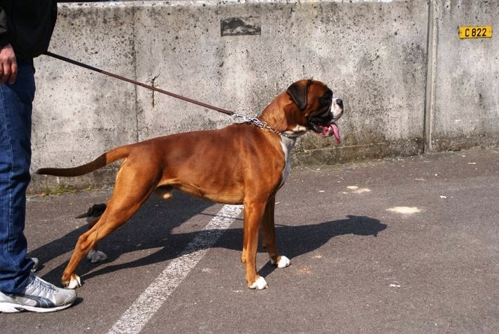 fauve marqué en blanc , exc construction ,chien bien court ,ligne dessus suffisament ascendente ,exc encolure puissante, exc tête masculine avec 1 bon rapport crane chanfrein, museau bien rempli dans ses 3 dimentions , exc prognathisme , machoire large , exc attache et port oreilles ,exc oeil , exc poitrail , poitrine , b ossature avec exc aplomps, exc angulations arrières , fouet naturel bien attaché , exc allures avec exc poussées