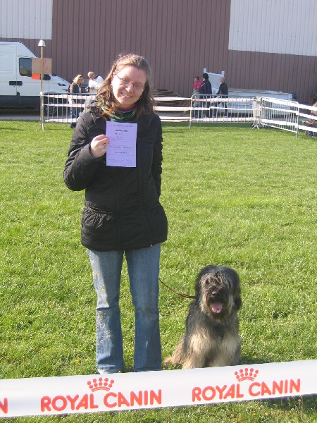 20 mois. Sujet de bonne taille. Très bonne tête en proportion. très bonne longueur du crâne. Oeil bien ouvert et bien coloré. Très bonnes oreilles biens implantées. Très bonne garniture en tête. Excellente pigmentation. Très bonne sortie d'encolure. Avant main un peu souple, excellent dessus. Poitrine à finir. Très bonne croupe, ouvert dans l'arrière main. Excellente angulation avant, un peu droit derrière. Excellente couleur de robe, texture correcte. Le poil manque un peu en longueur. Serre un peu derrière en aller-retour. Allures régulières de profil. Très bon caractère. Chien un peu mou.