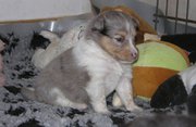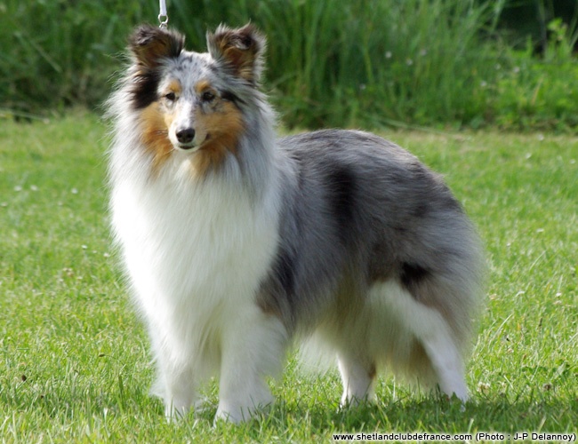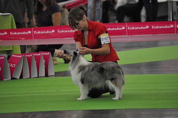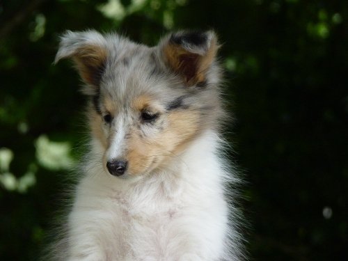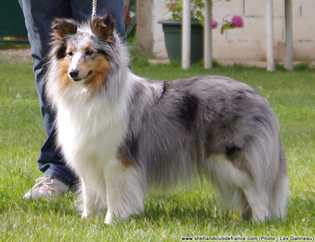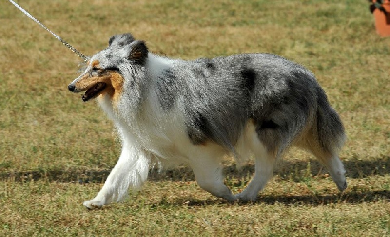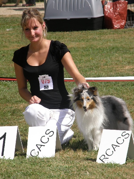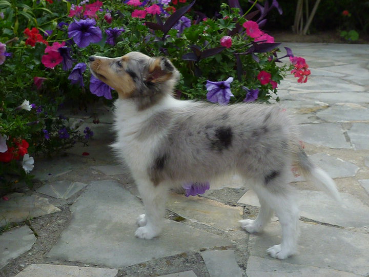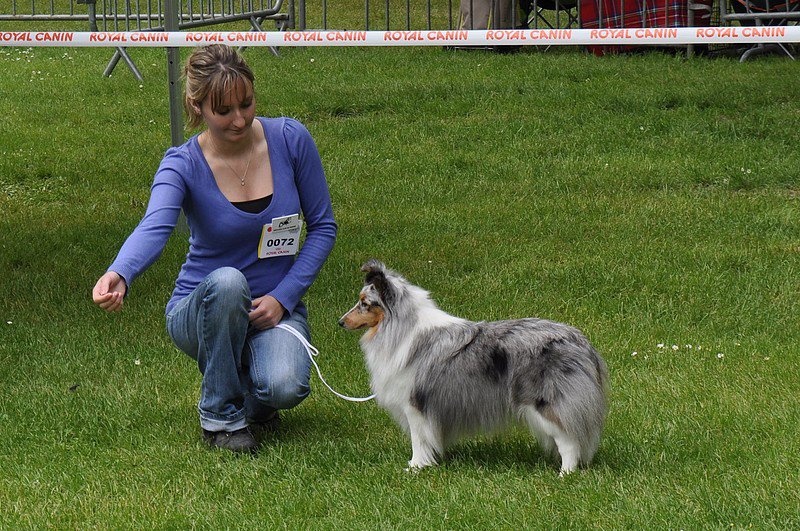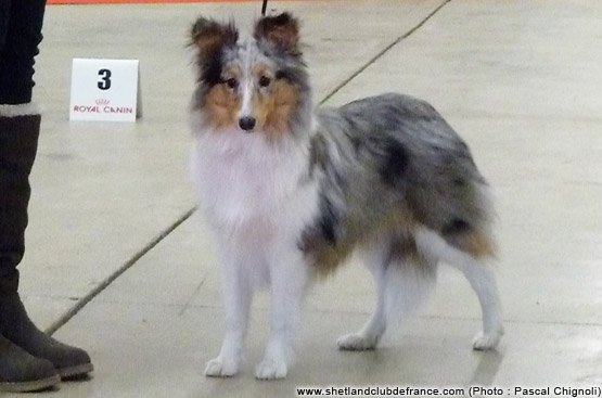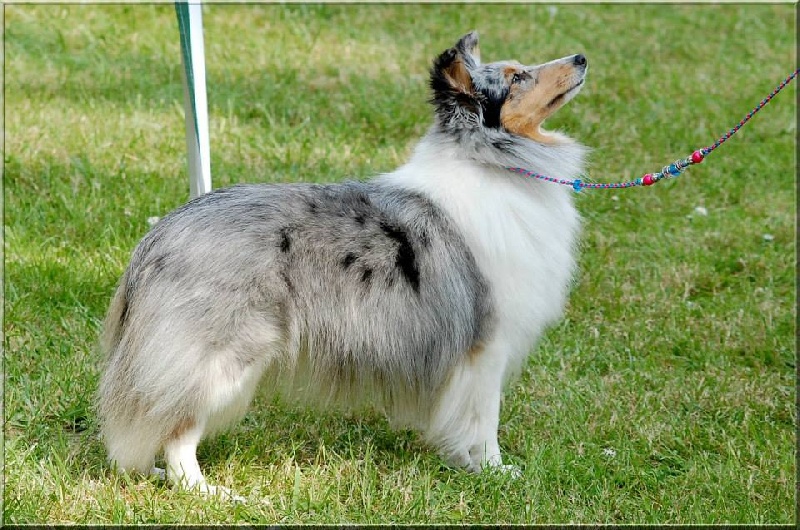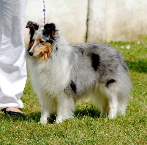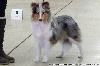 Taille idéale, DCC, femelle très séduisante d'une jolie couleur merleAttentive et calme dans sa présentationL'os est suffisant sans plusAvant main et arrière main bien placées et angulées, hélas commence une mueAllures correctes bien aisées et souples