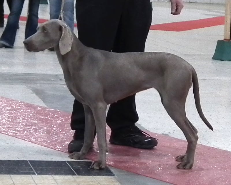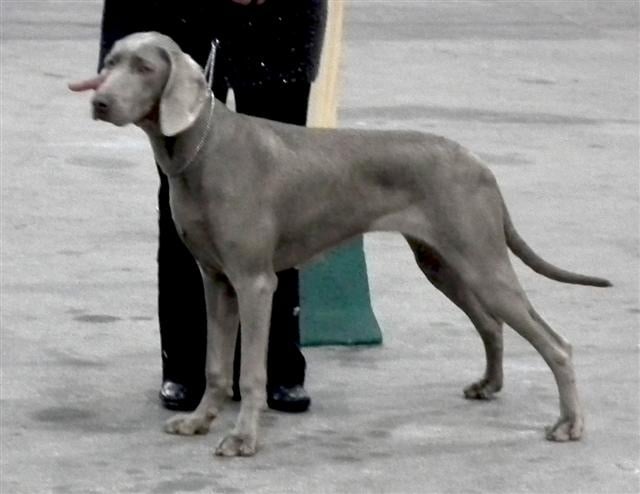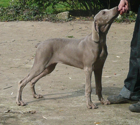 26 mois. 64 cm. Jolie tête bien Weimar, exc oreille bien portée, dans la bonne longueur, exc sortie d'encolure, le dessus pourrait être plus rigide. Etablie sur des aplombs puissants, avec une bonne angulation de la cuisse mais ouvre légèrement des antérieurs et décolle les coudes en statique, décolle aussi des coudes aux allures.