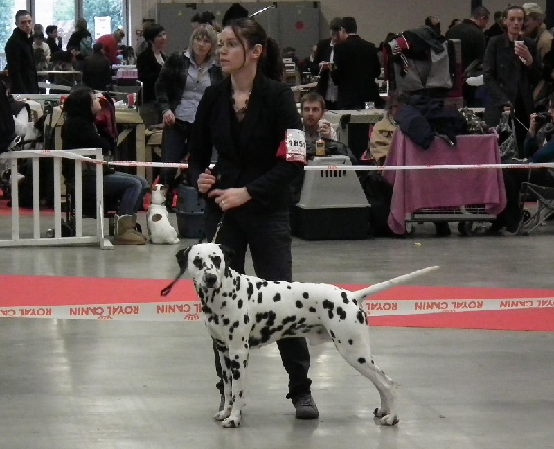 Exc proportion en tête, exc stop, exc oreilles, les yeux pourraient être un peu plus sombres, dentition en ciseaux, quelques taches buvards, exc ossature, exc épaule et poitrine, robe bien blanche, et taches bien disposées, queue bien insérée, marche bien