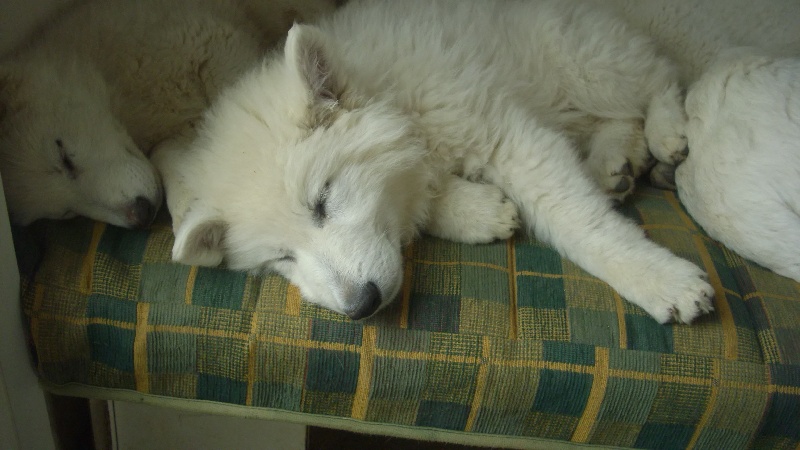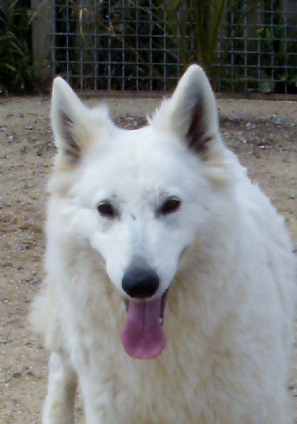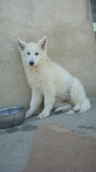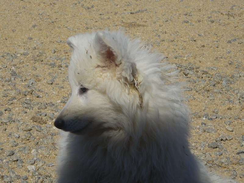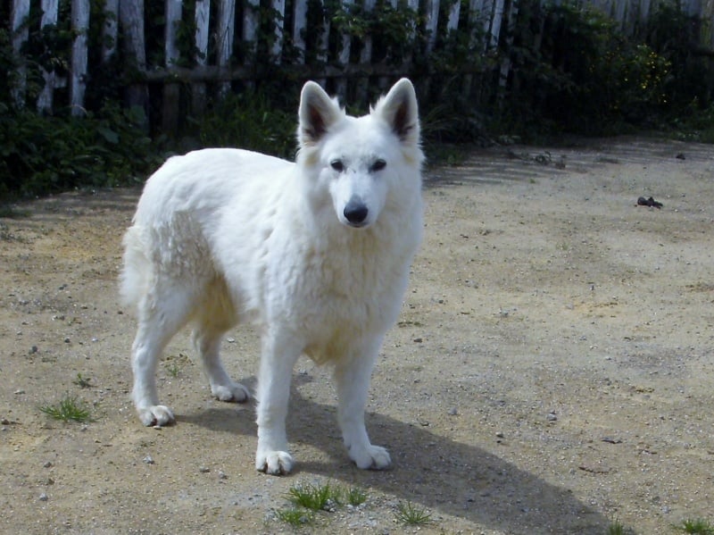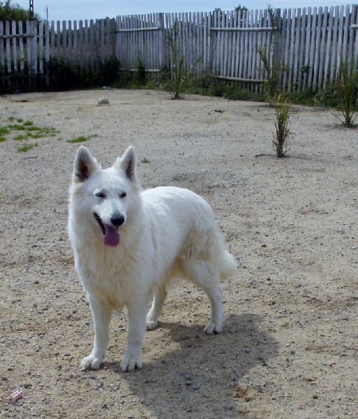 belle structure musculaire, compacte, épaisse fourrure blanc pur, épais sous poil, excellente pigmentation jusqu'au bout des ongles, yeux sombre, très bons aplombs, féminine, chien très calme douce et équilibré. structure osseuse et musculaire de la mère et fourrure du père. sur 5 générations sans dysplasie