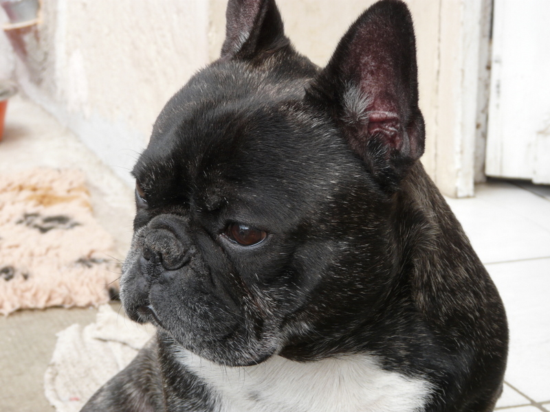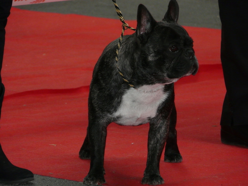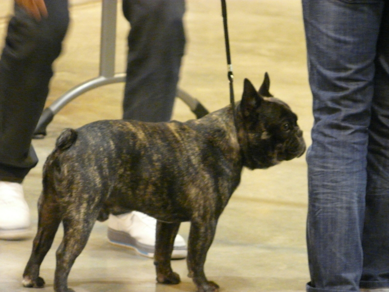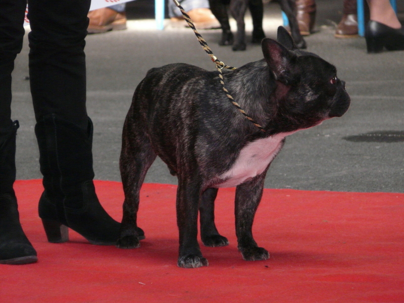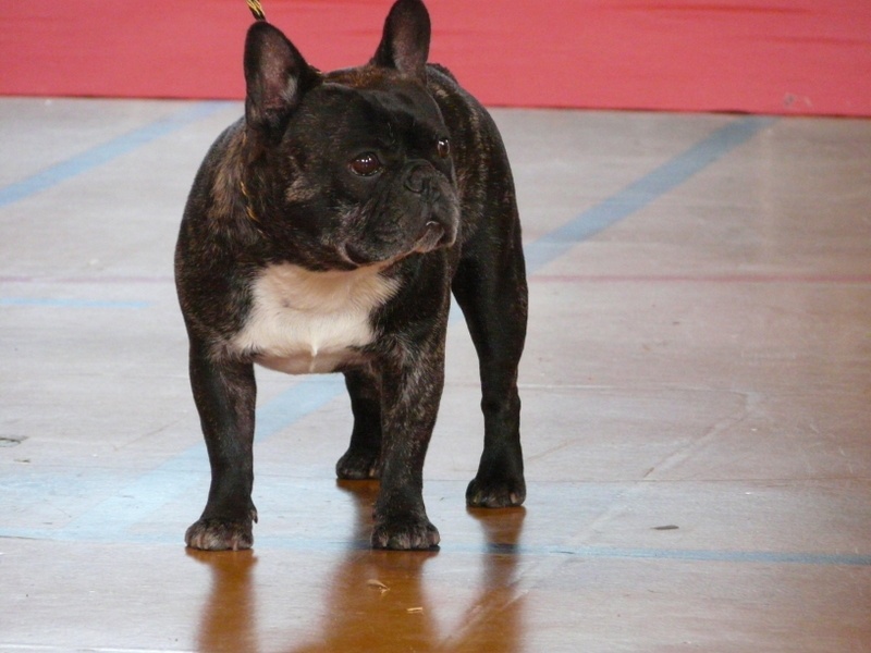 Mâle bringé moyen 13 kgs, excellent crâne, b angul, oeil bien plein, rides symétriques, oreilles correctes, bon dessus. Queue en croquet, bonne angulation avant arrière, bonne ligne de dessus, bonnes côtes en tonneau, excellent démarche.
