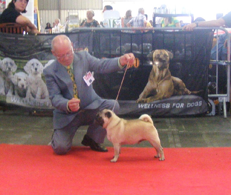 EXC SUJET,EXC PORPOTIONS ,exc téte,tb oreilles.exc yeux ,exc pig et narines ,exc denture, exc avant-main, exc poitrine et ligne de dos la queu bouclée et plaquée,exc postérieur,exc robe,exc demarche