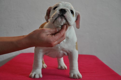En excellente condition. Chien compact. Beaucoup de substance. Tete avec une bonne expression typique. Crane fort, large et carre. Excellent chanfrein. Bonnes rides. Babines bien epaisses. Yeux fonces. Bonne courbure de la mandibule. Bonne ossature. Cotes bien rondes. Bonne ligne de dessus. Bon arriere main. Demarche lourde et contrainte typique. Excellente presentation. Chien calme et agreable. Joli sujet qui a de l'avenir.