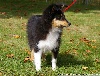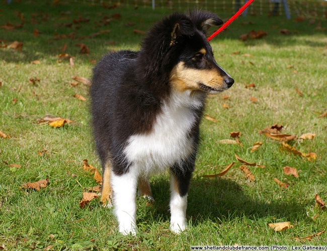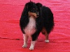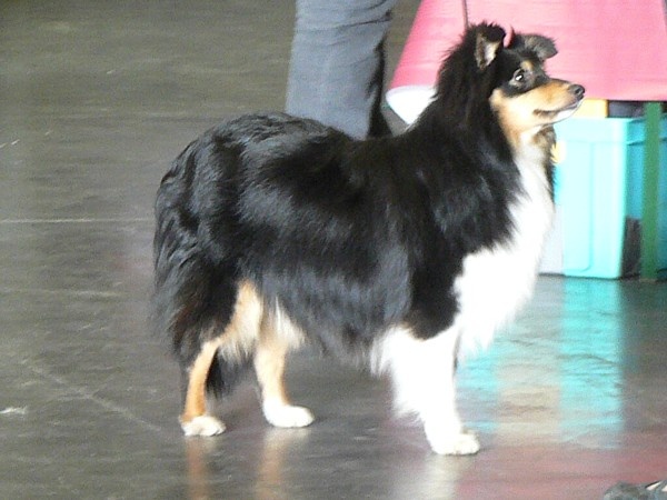 Noir tricolore, Jolie tête douce. Exc crâne, Exc expression, Exc parallélisme,Chien bien construit mais à tendance à plonger de l'avant.L'angulation arrière n'est pas idéale.Très beau chien dans l'ensemble.