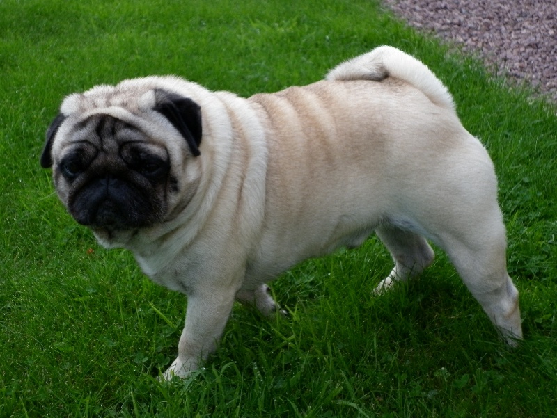 classe ouverte.Exc sujet très solide, B proportion, Exc crâne, oreilles bien plaquées, yeux et denture exc, exc épaules et avt main, poitrine, ligne de dos et posture exc, queue bouclée et plaquée.jolie robeexc démarche.