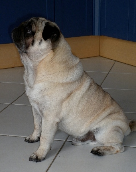 Classe ouverte. Machoire à la limite. tête volumineuse, bien ronde, oreilles correctes, bonne expression. Ride envahissante, la narine devrait être + ouverte, menton faible. ant.correctes, angulations correctes, allure correcte, la ligne sup pourrait être + tendue.