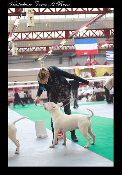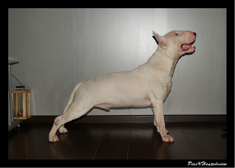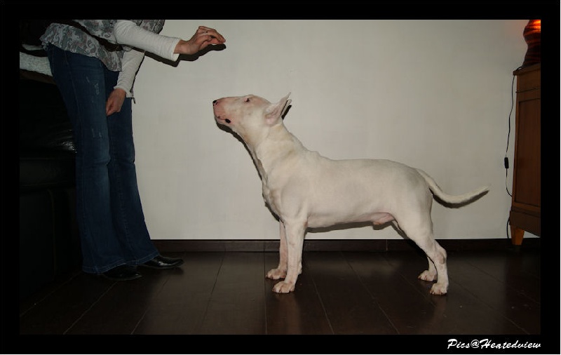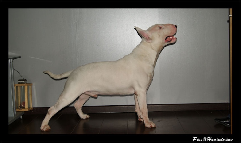 le rapport crâne/chanfrein est trés bon, trés bonne dent et articulé. Le rapport pied ant est excellent, dessus de crâne plat, nez bien incliné, narines bien ouvertes, excellent epaule, belle ligne de dessus, belle sortie d'encolure, belle ligne de dessous mais un peu horizontale (j'aimerai un ventre plus relevé) excellent arriére main - jarret - grassetMagnifique pieds, doigts bien serrés, excellent mouvement avant et arriére, manque de discipline sur le ring.