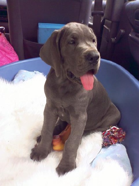10 mois, grande femelle de bonne couleur, mais encore en mue. Tête longue et étroite, yeux moyennement foncés, encolure avec un peu de peau, épaule en place, bonne poitrine, le poitrail doit s'éclater, lignes du dessus et dessous correctes, bonne angulation arrière, croupe légèrement tombante, démarche correcte mais ne prenant pas assez de terrain, il va falloir me la faire travailler au trop !