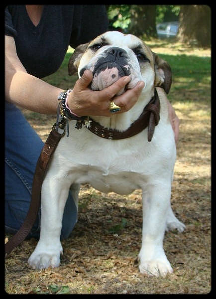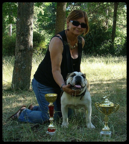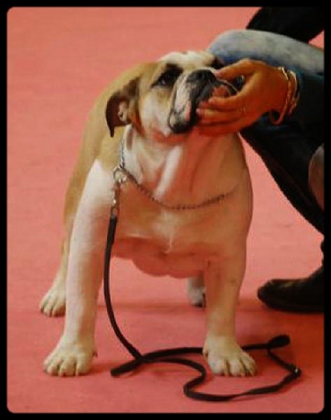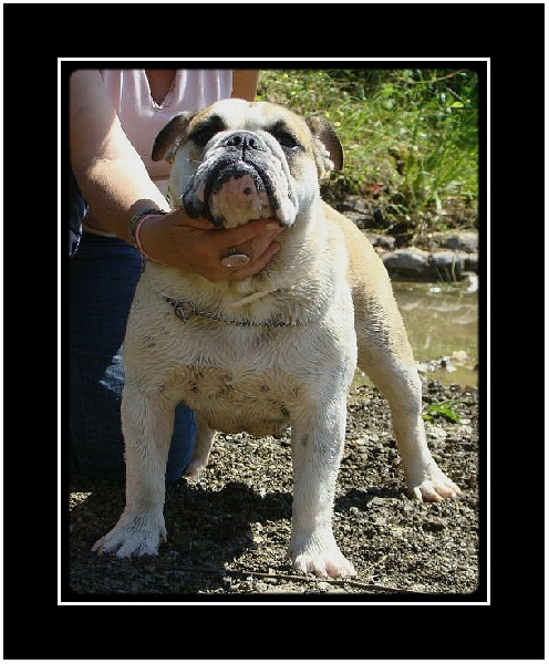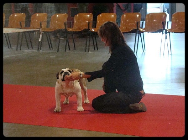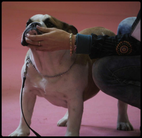fauve a panachure blanche.en excellente condition.tres feminine.crane fort,large et carré.bonnes rides,bon cou.yeux bien foncés,sclérotique apparent lorsque le chien regarde devant lui.oreilles en rose.prognatisme maximum.cotes bien rondes.bonne ligne de dos.bon arriere main.bonnes angulations arriere.queue droite.demarche lourde et contrainte typique.serre a l'arriere.bonne présentation.chien calme et agréable.doit se developper.allures juveniles