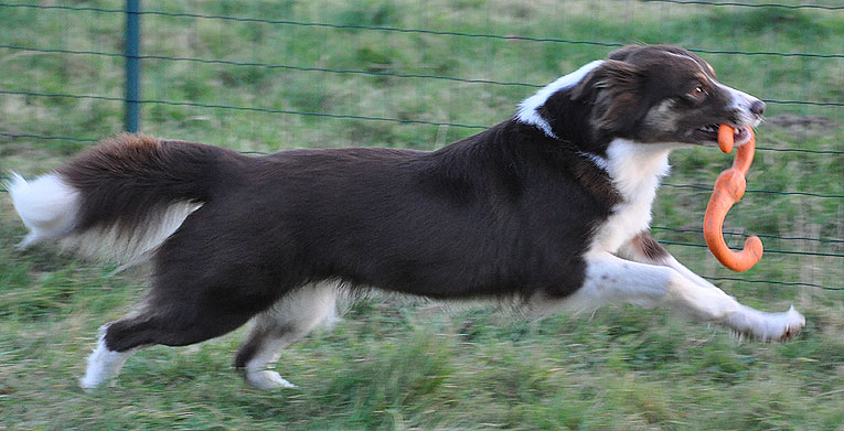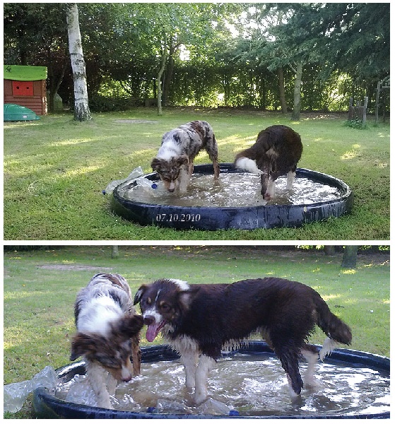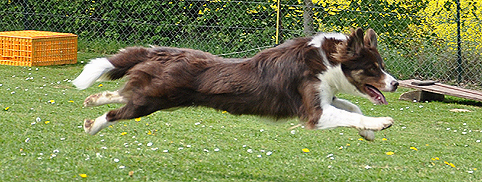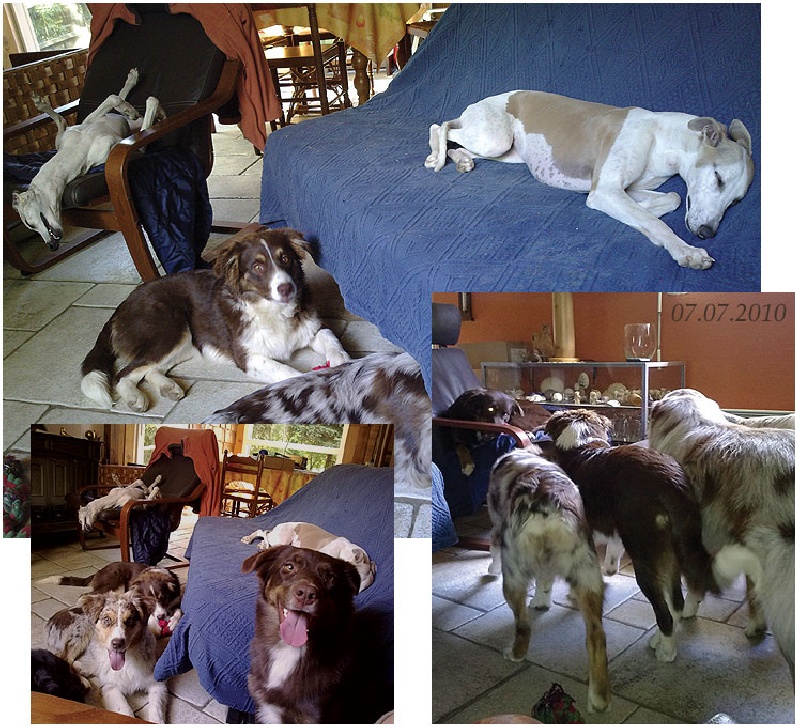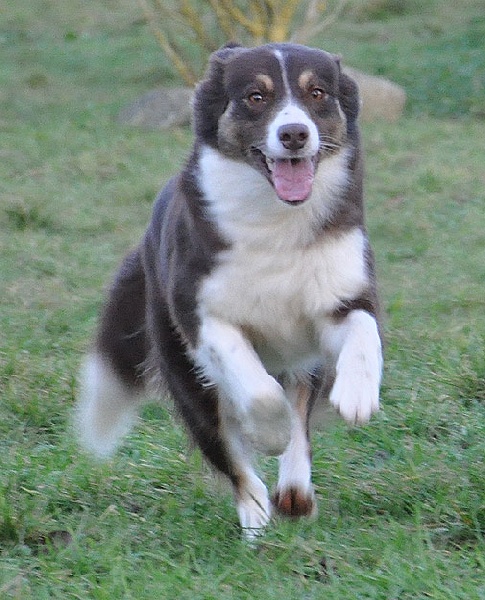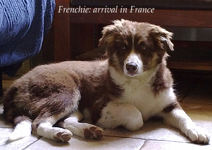 Importée des USA Colorado à 4 mois, ses parents travaillent au ranch, ce sont également des compétiteurs, Frenchie est une gentille working très sociable, en général non dominante avec les autres chiens mais elle a ses têtes et n'aime pas les jeunes turbulants. Fort instinct de prédations et bonne gardienne, aptitude naturelle troupeau et rapport d'objet, respectueuse et soumise avec l'humain (sensible mais pas peureuse). Très câline, pôt de colle, très dynamique à l'extérieur, aime l'eau, elle est calme à la maison. Participe aux séances d'éducation en groupe en tant que chienne régulatrice. Respecte les clôtures et les zones de détentes, évolue sans problème parmi les chevaux est aux ordres.