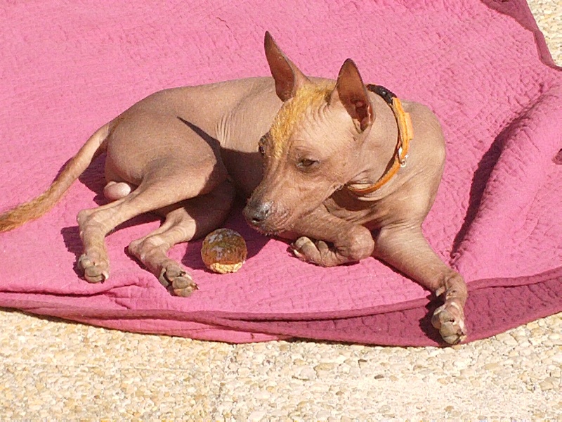 Bonne construction dans l'ensemble, testicule en place, bon rapport crâne chamfrein, oreilles bien attachées portée timide. oeil exc, Machoire bien adaptée, exc encolure, exc épaule, bonne musculature, poitrine juvénile doit s'éclater, ligne de dos pourrait être plus tendue, bonne attache de queue, angulations correctes bonne élasticité de la peau, manque pigmentation