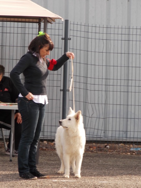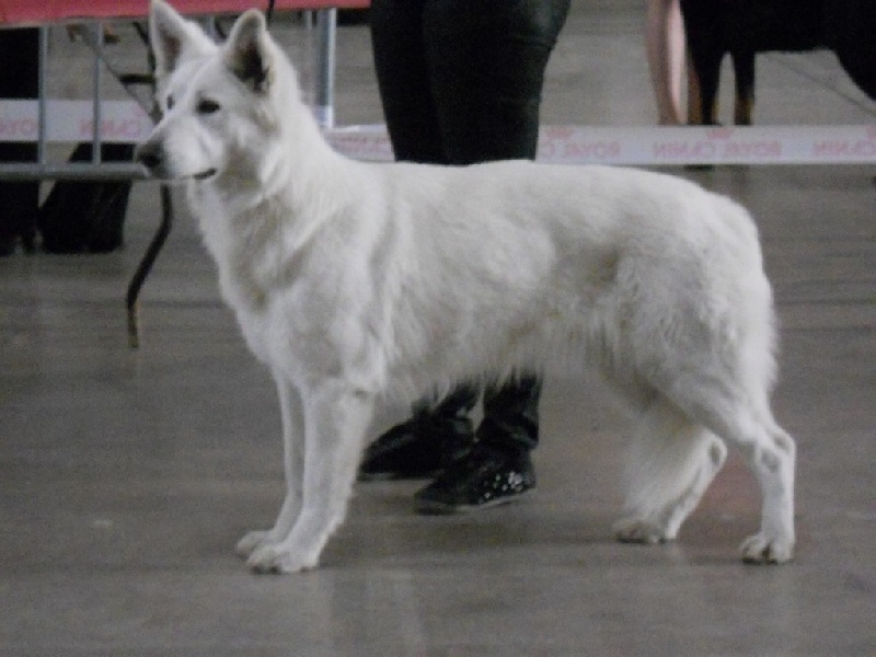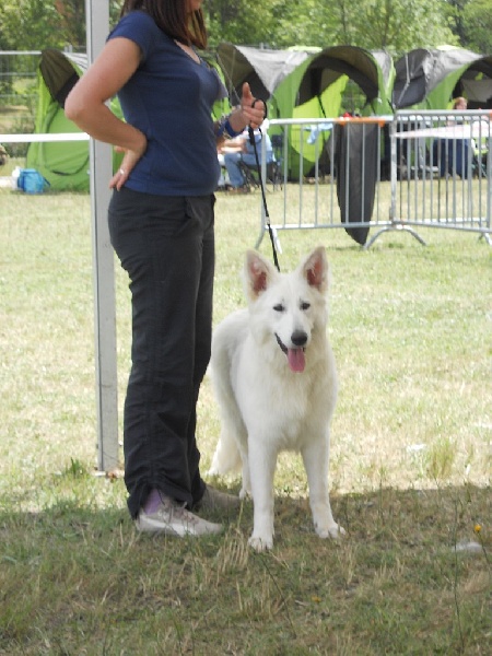 DCC.taille moyenne,un peu méfiante,tête en rapportde bonne forme et proportionsoeil bien foncé.TB pigmentation.oreilles bien portées;TB encolure,dos,rein et croupe; poitrine correcte ,TB aplombs& angulationsmanque encore de maturité,devrait bien s'épanouirTB poil et sous poil.bonne démarche15 mois