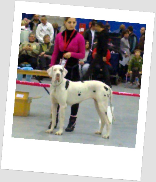 DCC, taille standard, bon corps presque carré, tête typique bon parrallélisme, oeil pourrait être plus foncé, bon encolure, ligne de dos pourrait être plus tendu, bonne croupe, queue correcte, poitrine doit encore se faire, très bonne angulation avant, angulation arrière un peu raide, robe blanche avec quelques petites tâches noires sur le flanc gauche, truffe pigmentée au 2/3, démarche correcte