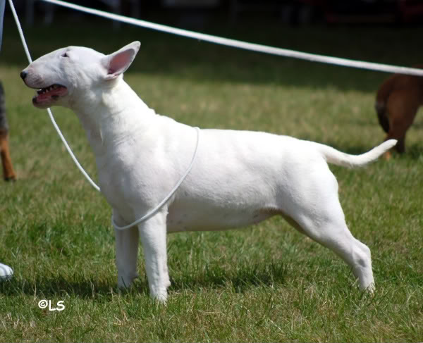 COMMENT : well balanced white, nice expression, small eye, ears almost on top, scissor bite, shapely bodylines, correct tailset, moved well
