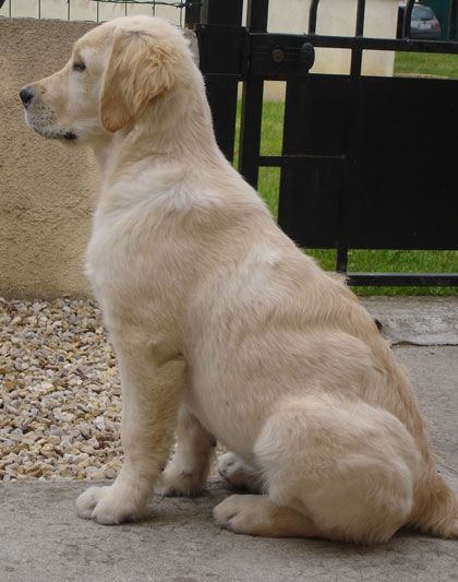 BON - Appréciations du Juge : Joli type de femelle dorée, avec une jolie tête. Bonnes angulations avant, cependant serait plus harmonieuse avec des pattes plus charpentées. Bonne ligne de dos en statique et en mouvement. Aimerait un peu moins de poids afin de faire ressortir sa musculature.