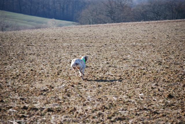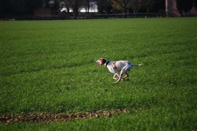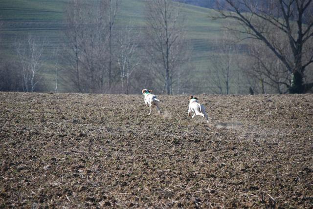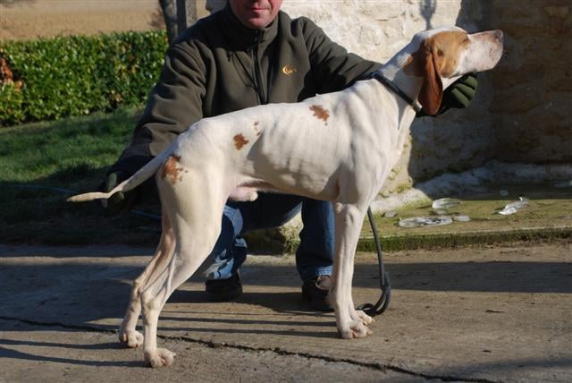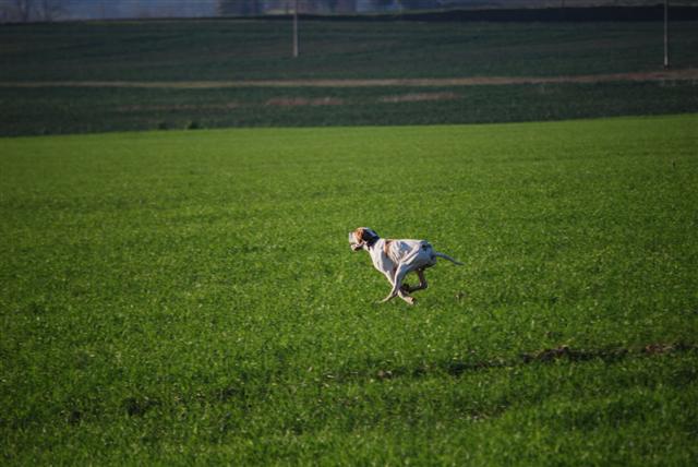 Issu de l'union d'Astrée de Vassivière et de Titan, Eiger est un jeune mâle au caractère franc et fonceur. D'excellente construction, il dévéloppe un galop énergique et rapide. A 20 mois, je n'ai, du fait de mes obligations profesionnelles, pas eu le temps de m'occuper de lui et il n'a donc pas chasser cette saison. Par contre, les entraînements de ce printemps lui ont fait le plus grand bien et après avor rencontré queques decouples de rouges sauvages, il a pris une ampleur de quête qui laisse augurer beaucoup mieux que la chasse. Eiger a tout compris de la tenue des oiseaux et les cherche véritablement allongeant ses lacets et explorant toute bordure ou denivellation du terrain permettant de les cacher. Sa prise de terrain, de plus en plus importante, n'a aucn effet négatif sur son contact et malgré la distance, il reste bien dansla main. Eiger semble, aujourd'hui, s'affirmer comme un chien de field ou destiné à une chasse emminement sportive sur des terrain sélectif tels que peuvent l'être la montagne, le marais ou la grande plaine. S'il confirme le potentiel que j'entrevois en lui depuis tout petit, Eiger risque bien d'être la perle rare que tout un chacun recherche.
