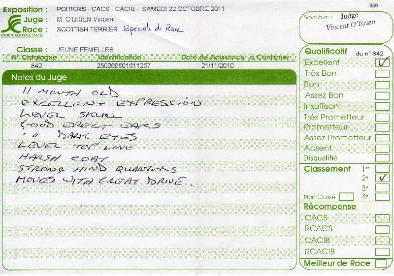 Exc tête, yeux, oreilles & denture. exc encolure. Ligne de dessus correcte. exc pattes & pieds. queue bien placée & portée. Exc poitine & côtes. exc texture & couleur.