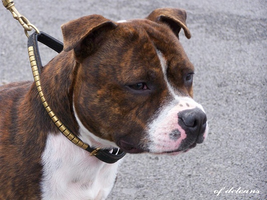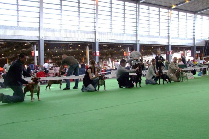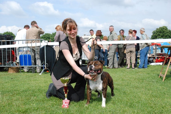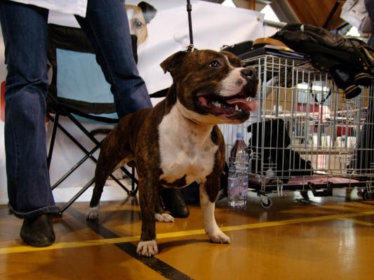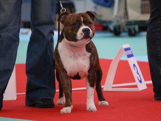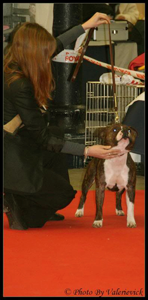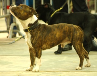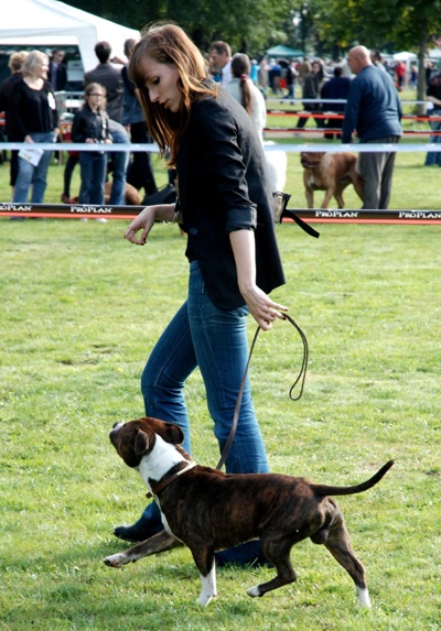 Brindle dog with white. Excellent head shape. Good bite. Straight part. Top line OK. Strong hindquarters. Moves OK. Very stricking dog. (Traduction : Chien bringé avec du blanc. Excellent forme de tête. Bonne dentition. Ensemble rectiligne/droit. Ligne du dessus OK. Puissants postérieurs. Se déplace bien. Chien très remarquable). Qualification pour la "meilleure condition physique".A la fin du jugement, j'ai pu recevoir quelques conseils du juge : Cliff semble manquer d'angulation mais en fait, il/je le place mal et se raidi complètement des postérieurs. C'est ce qui donne l'impression de manque d'angulation. Cliff a été bien apprécié, aussi bien niveau caractère que morphologique. Ce même juge a d'ailleurs précisé qu'il n'avait jamais jugé de chiens d'aussi bonne qualité dans cette classe. Il a bien sûr fini par nous inciter à sortir en UK Maybe, one day...