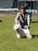 Masculin, tête correcte, pigmentation correcte, bonne ligne supérieure, bonne implantation de la queue, excellente qualité de poil avec un peu de couleur, mouvement avant un peu serré